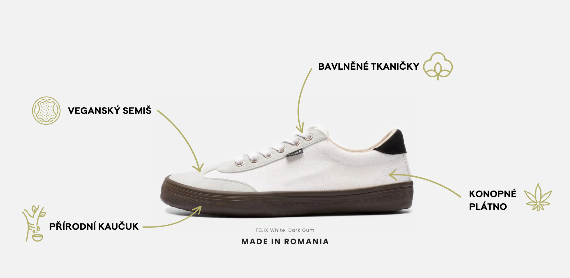 Plátno tenisek vyrábíme z konopné příze pocházející z Rumunska, od firmy, která ctí tradiční metody pěstování konopí a dbá na minimální dopad na životní prostředí. Příze se dále zpracovává v české tkalcovně, kde se proměňuje v plátno. To následně putuje do rodinné české společnosti, která jej barví ekologickými barvami.